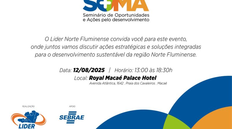 Na próxima terça-feira (12), Macaé será palco do Seminário de Oportunidades e Ações pelo Desenvolvimento do Norte Fluminense (SOMA), que acontece das 13h às 18h30 no Royal Palace Hotel. O evento, promovido pelo Líder Norte Fluminense, conta com o apoio da Prefeitura de Macaé e do Sebrae/RJ, e reunirá prefeitos, especialistas, empreendedores, educadores, técnicos e representantes da sociedade civil dos nove municípios da região.
