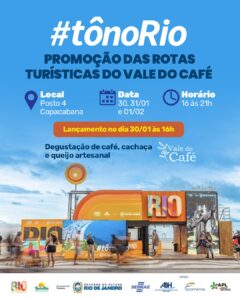 Mais uma vez o Vale do Café será divulgado em uma das praias mais famosas do mundo, por meio do projeto “Tô no Rio”. Ao longo dos dias 30/01, 31/01 e 1º/02, no Posto 4 da Praia de Copacabana, o contêiner instagramável da Setur-RJ será palco de uma ação de promoção das rotas turísticas do Vale do Café realizada pela Secretaria de Estado de Turismo (Setur-RJ), com apoio de Sebrae e ABIH.